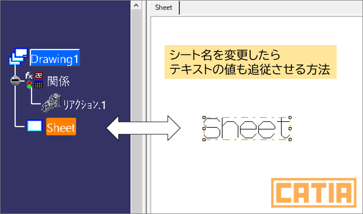 イメージとしてはCATPartで「式」を使ってパラメータ同士の値を紐づけるように、シート名を変更したら何もせずとも自動でテキストが変わるようにしたいところです。