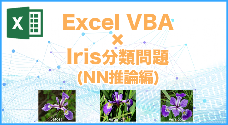 本ページではこれまでに実装したすべてのコードを使ってIrisの運類問題をさせていきます。任意の4つの数字をニューラルネットワークに読み込ませ、花の種類を認識させることがExcel VBAにもできるのかを実際に体験してみましょう。