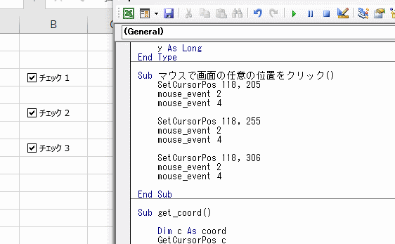 またGetCursorPos関数の引数「lpPoint As coord」の「coord」は自身で用意する必要があります。